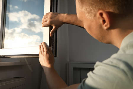 Blurred viewpoint. Closeup of a thoughtful young man seen through a window.