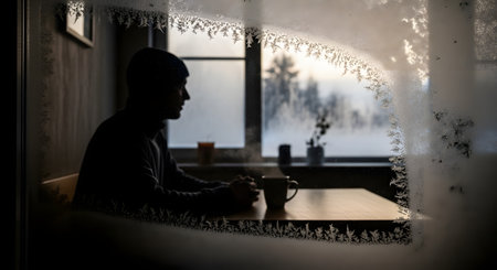View through a frosted window frame of a man's silhouette sitting at a table inside a warm room. He holds a mug, looking out at the cold winter landscape, creating a cozy contrast.