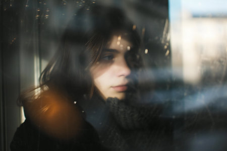 A portrait of a young woman with short hair looking thoughtfully out of a window. The natural light illuminates her face, capturing a mood of contemplation, melancholy, or quiet observation.