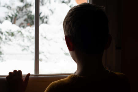boy with his back against the light looks at the snowy landscape through the window of his house.