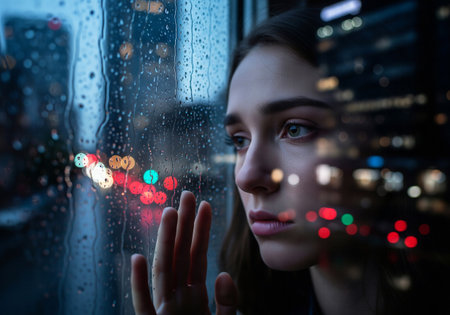 Pensive woman touching a rain-soaked window with city lights reflecting at night