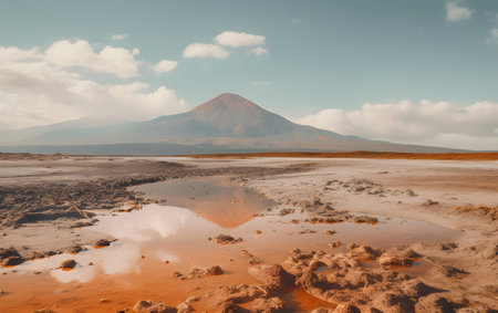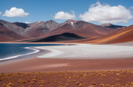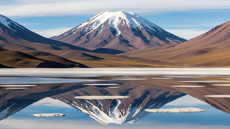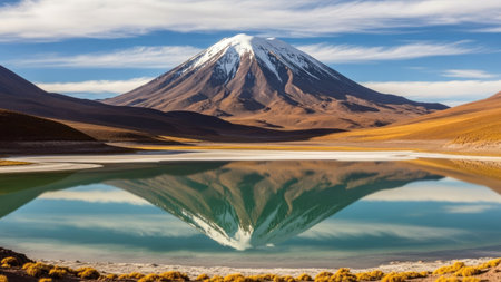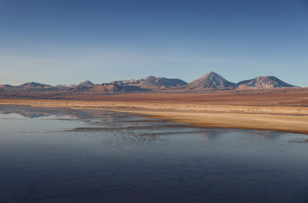 This breathtaking photo captures the idyllic Lake Lejia with its reflection and stunning volcanic landscape in the Atacama desert of Northern Chile, South America. The crystal clear water of the lake reflects the majestic mountains and the blue sky, creating a serene and tranquil atmosphere. This image is perfect for nature lovers, travel enthusiasts, and those who appreciate the beauty of our planet.