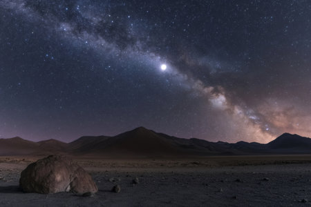 Night sky filling a desert landscape, showing the Milky Way galaxy arching above mountains and a bright planet