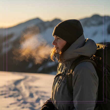 Female hiker with backpack on top of a snowy mountain at sunset.