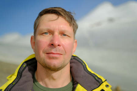 Close-up portrait of a man in the mountains. Tourist climber on the background of Mount Kazbek. Climbing Kazbek from the north, from the side of Russia. Hike across the Caucasus.
