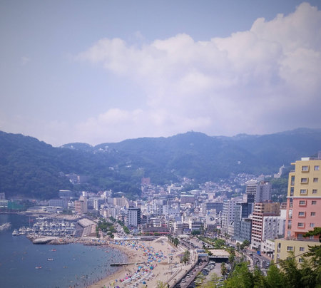 Japanese tourist spots / Townscape and seagulls seen from the sea of Atami