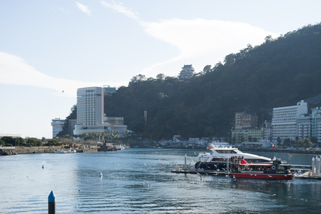 ATAMI, JAPAN - OCTOBER 27, 2012 : View on Atami Tamanoyu Hotel from Swimming Pool locality