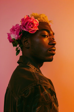 Man with flowers in hair and flower crown on head, posing confidently outdoors on a sunny day