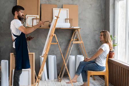 male artist dressed in a blue dirty apron stands in the studio barefoot and paints a womans portrait. Girl model in casual clothes posing for him.