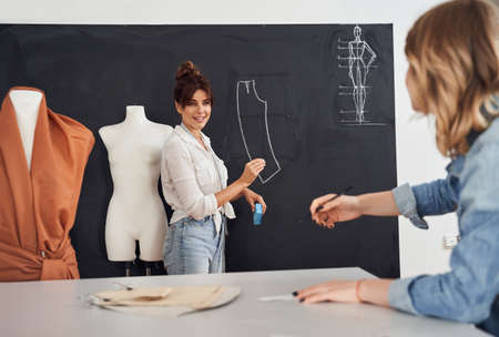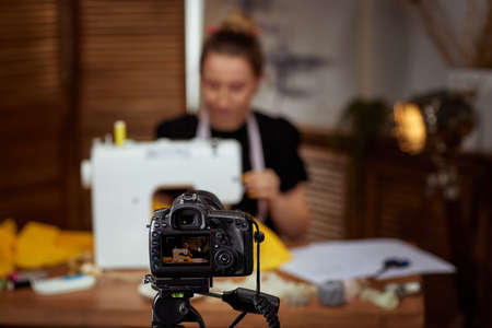 Young girl fashion designer working on new product in studio. Photography for blog or ad educational courses or clothing