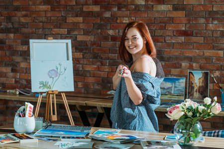 Art hobby. Studio workspace atmosphere. Smiling redhead female posing with paintbrushes and easel in background.