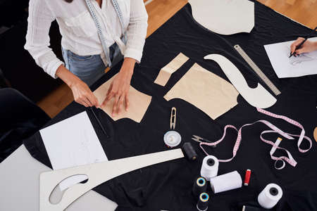 Hands of two fashion designers discussing their sketches of trendy clothes