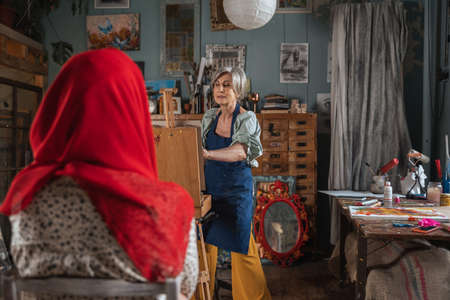 Senior woman taking on her apron while preparing to the drawing at her art studio