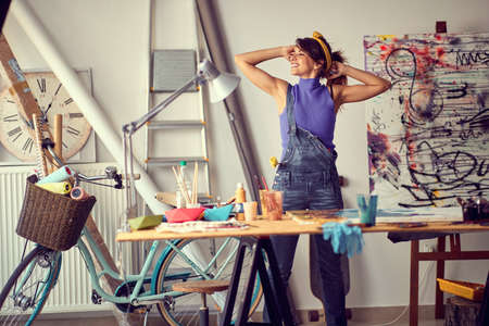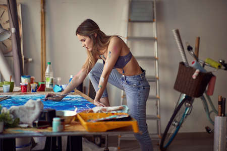 A very hot and sexy young female artist is standing over the table and working on a new painting in a relaxed atmosphere in her studio. Art, painting, studio