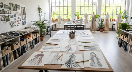 A wide shot of a bright and modern fashion design studio filled with sketches on a large wooden table. Mannequins dressed in prototypes and sewing stations line the windows, showcasing the creative workspace of a designer.