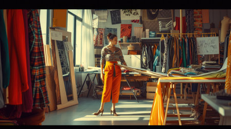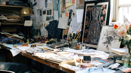A fashion designer's workspace, filled with sketches, fabric swatches, and inspiration boards.