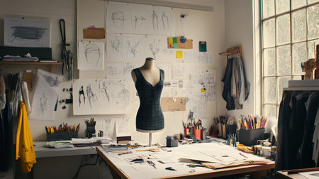In a dressmakers workshop, a mannequin displays a prototype dress amidst sketches and tools, showcasing the creative process of fashion design