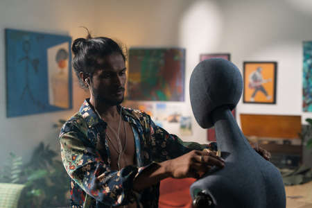 Young contemporary fashion designer standing in front of mannequin while working over new seasonal collection of clothes in studio