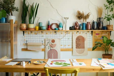 Interior of workshop of contemporary designer or studio of artist with supplies for painting on table and handmade items on shelf along wall