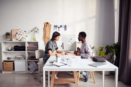 Multiracial male and female fashion designers discussing over sketch at desk in office. Unaltered, creative business, teamwork, fashion, workplace.