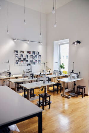Rows of tables with sewing machines and pictures on white wall in workshop