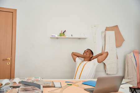Attractive young man learning how to design and create a fashion dresses at a workshop