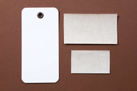 Three white and gray cardboard rectangular blank tags for clothes positioned in center of brown background with white one put vertically and gray ones horizontally. Tag mock up. Copy space