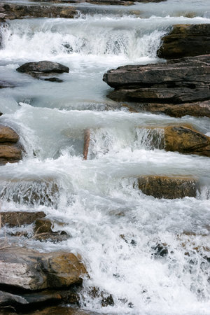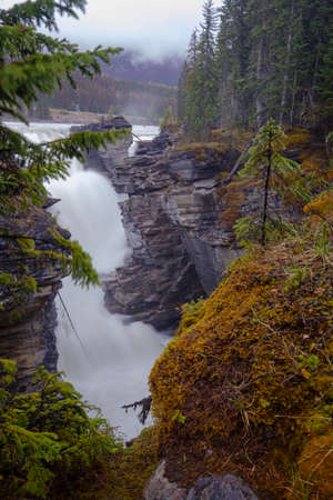 Beautiful Athabasca waterfall as it passes through Jasper in the Canadian Rockies.
