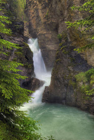 The turbulent waters of Lower Falls at Johnston Canton in Banff National Park in Alberta Canada. This popular tourist attraction features the turquoise blue waters of glacier melt. It tumbles and cascades down a narrow gorge with several waterfalls along