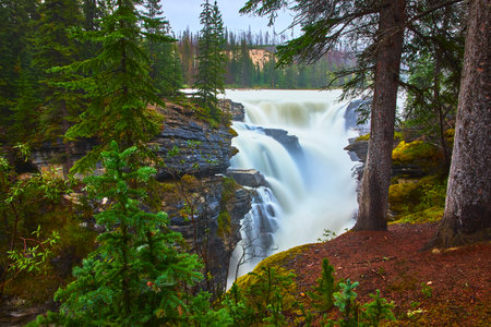 Stunning view of Athabasca falls at Jasper Provincial Park, Alberta, Canada. Green trees, and a mountain in the background. Powerful waterfall in a rainy day