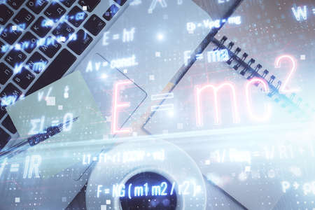 Physics and math theme hologram with formula drawings over computer on the desktop background. Top view. Multi exposure. Concept of education.