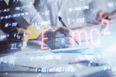 Double exposure of formula drawing over people taking notes background. Concept of education