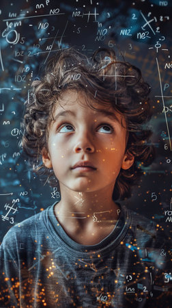 A contemplative individual with curly hair gazes inward as luminous mathematical formulas cascade over their shadowed profile, illuminated by warm indoor sunset hues