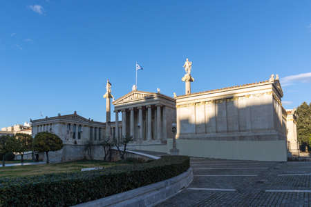 ATHENS, GREECE - JANUARY 19, 2017: Sunset view of Academy of Athens, Attica, Greece