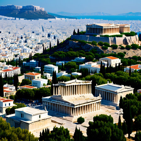 Temple of Hephaestus viewed from mountain top in Athens, Greece.