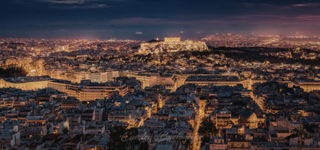 Acropolis of Athens and Athens Greece - panoramic view from Lycabettus hill at dusk