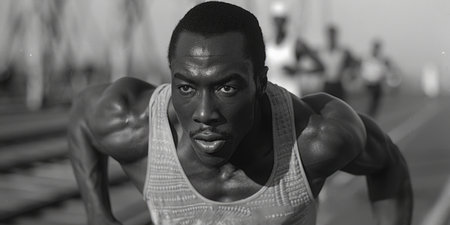 A determined sprinter prepares for the race, showcasing intense concentration and athleticism on a vibrant track. His focus is sharp, embodying the spirit of competition.
