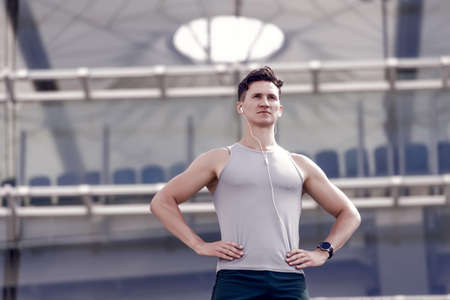 Portrait of a handsome athletic man at the stadium. Sport concept.
