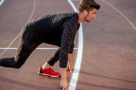 Male athlete on starting position at running track. Runner practicing run in stadium racetrack