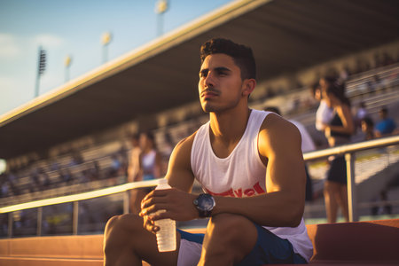 Latino sprinter maintains hydration during a refreshing break amid a bustling stadium. Concept Sports, Hydration, Latino athlete, Stadium ambiance, Refreshing break