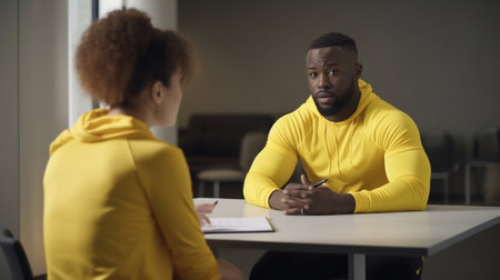 Generative AI : Friendly African American man in yellow sweatshirt and glasses emotional speak while sitting at table and speaking on smartphone during work from home