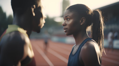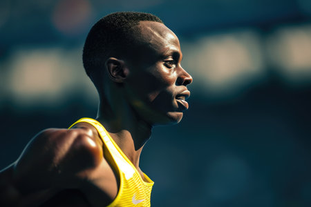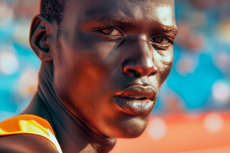 Close-up portrait of an African American athlete runner at the stadium. Portrait of an Olympic athlete