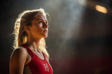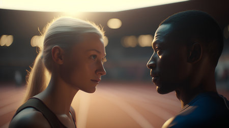 An evocative image suited for use in sports apparel campaigns, motivational fitness content, or articles discussing athlete mindsets | This photograph portrays a young male athlete in a moment of focus and determination before a competition or workout. He is pictured in a close-up, occupying a large portion of the frame, with a warm, blurry background, imparting a sense of immediacy and intimacy with the subject. The athlete's crisp, clear eyes gaze directly ahead, perhaps visualizing the race to come, while his athletic attract hugs his form, emphasizing his physical readiness and vitality. The soft, golden hour light illuminates his profile, highlighting his features and casting an almost halo-like glow around him, which not only accents the contours of his face but also suggests an aura of inspiration and perseverance. The blurred lanes of the track in the background evoke the setting of disciplined training and the pursuit of excellence inherent to track and field athletes | Perfect for incorporation into fitness inspiration blogs, advertising health and wellness products, or as visual material for coach's training manuals. The photograph also has potential as a powerful illustrative element in storytelling to convey themes of ambition, preparation, and mental strength. Additionally, it could grace the walls of sports facilities or personal gyms as a symbol of the dedication required to excel in athletics | a compelling portrait of a focused track athlete, set against a softened backdrop of a running track, bathed in the natural light of sunset, which underscores the themes of anticipation, training, and the athlete's mental game, with ample negative space suitable for text overlays or additional design elements