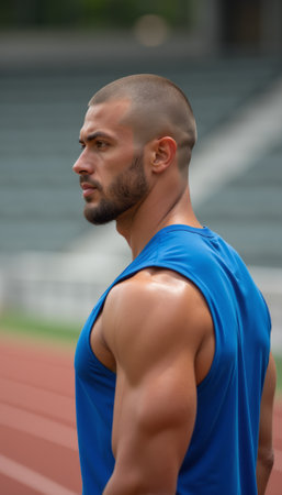 A muscular man with a close-cropped haircut stands confidently on a running track, exuding determination and strength. His intense gaze and athletic build highlight the dedication and hard work that goes into achieving peak physical performance.
