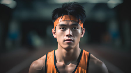Portrait of young Asian basketball player in sportswear at the stadium.