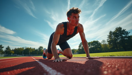 A focused young man in athletic gear is crouched on a red running track, ready to launch into a sprint under a bright blue sky. His intense expression and muscular build convey determination and readiness, embodying the spirit of competition and athleticism.