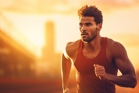 Athletic man running on an urban track, showing dedication during sunset