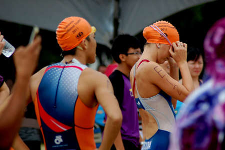 Group of young professional female runners wearing t shirts with number looking at camera while standing together, ready to start the race