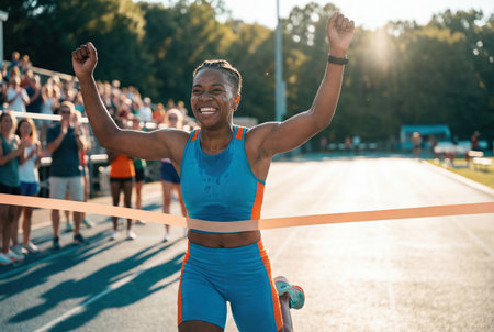 Triumphant african american woman runner breaks the finish line tape on a sunny track with raised arms while celebrating her winning moment at the outdoor stadium.