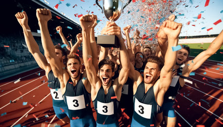 A close-up shot captures a track and field team celebrating their championship victory with confetti in the air. Athletes hold the trophy high, with joy and excitement on their faces. The running track and cheering spectators in the background enhance the festive atmosphere.